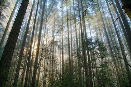This photograph was made when a light marine fog was just barely higher than the tops of the (very tall) trees. This allows you to see where rays of sunlight make it past the trees. This effect is strongest when the sun is low in the sky however, in this picture, a wide-angle focal length is used making it appear as if the sun were low when, in fact, it was about as high as it gets for a winter day in Vancouver.