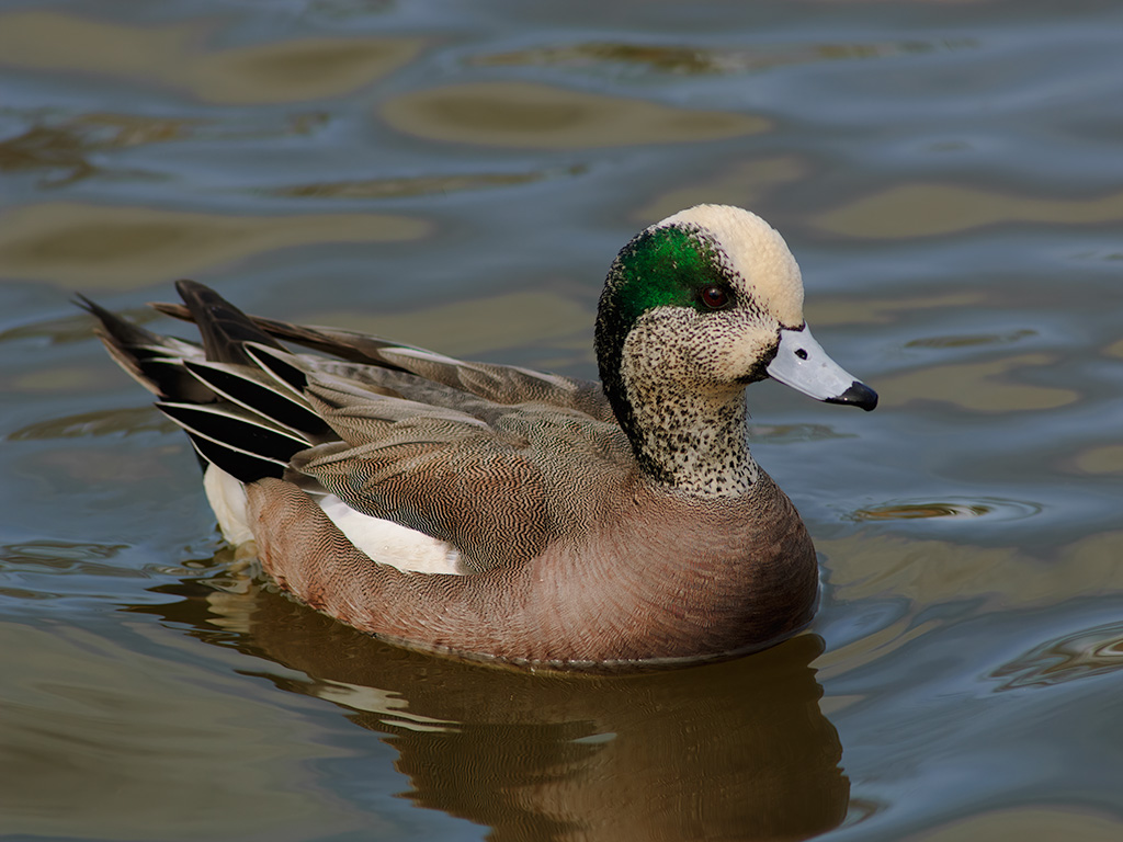 We have widgeons in our area all year, although there seem to be more over winter than in the summer. These ducks don't quack, instead they have a distintive wheeze. The male has a prominent white patch on its forehead, the female's have a pattern fairly typical of female ducks. Here is a picture of a female widgeon.
