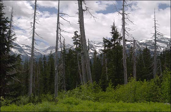 In this image, we are looking west from the abandoned forest road that runs along the Callaghan Valley. The peaks beyond the forest may be hosting some of the Olympic games in 2010. The dead and falling trees show a bog lies below. Let's take a closer look at this area.
