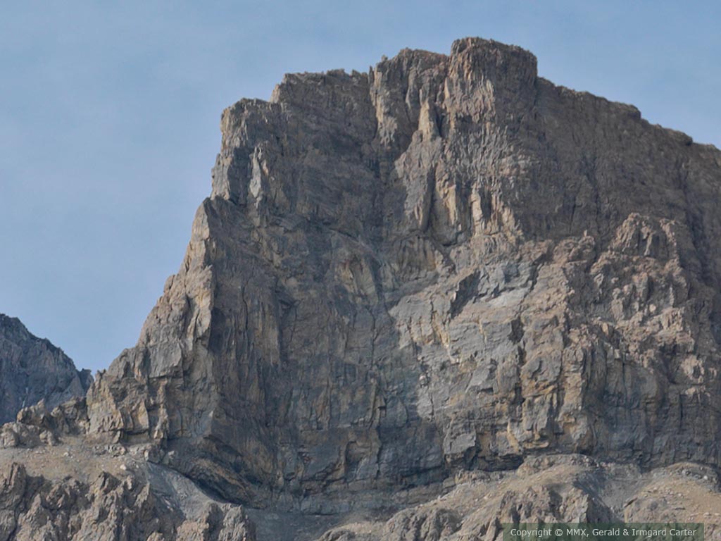 Crowfoot mountain is in Banff National Park, north along the Icefields highway about 40km from Lake Louise. The mountain appears to be rising out of Bow Lake in this picture, but the lake barely surrounds 1/6 of the mountain itself. The name of the mountain comes from the look of a glacier, which appears to have the shape of a bird's foot from the right angle. This, however, is not the right angle, the glacier is to the far left.