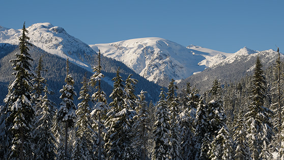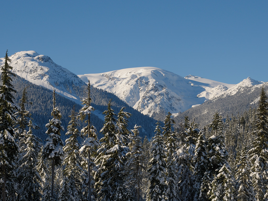This picture was made from the ski jump venue for the 2010 winter Olympics. Access to the area has been made much easier as a result of the games, we no longer need to use a Land Rover to get there. Callaghan Lake (see this page) is at the base of these mountains behind the trees.