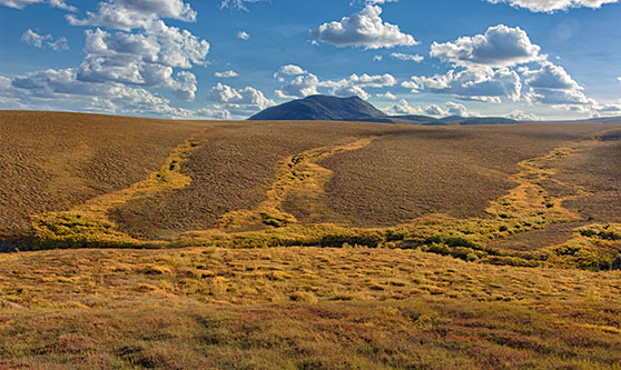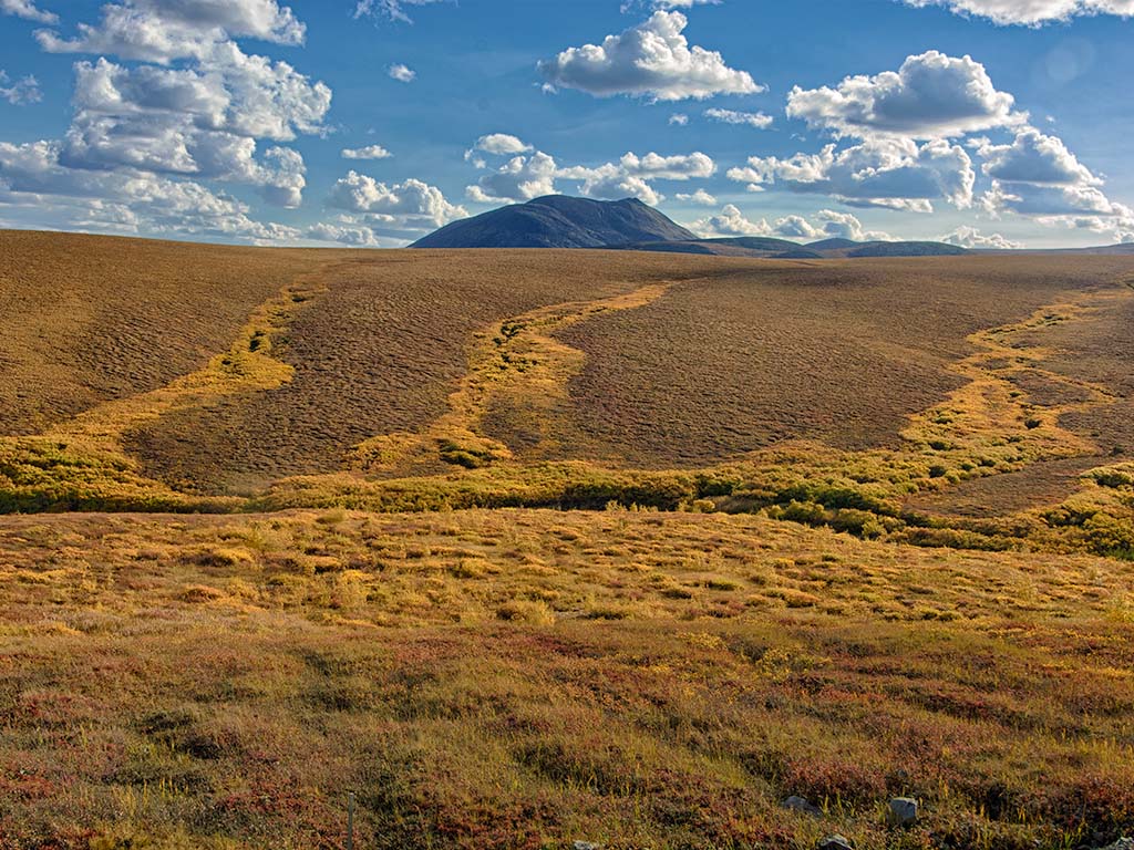 This photograph was taken steps away from the Dempster Highway in the Northwest Territories (Canada) approximately halfway between Fort MacPherson and the border to the Yukon Territory. The mountain in the background is part of the Richardson Range. This is arctic tundra in late summer. The plants are lighter in the creek beds (that were dry when this picture was taken) than the grass and scrub that covers most of this land. A little closer to Fort MacPherson (and the Peel River valley) the landscape changes to taiga.