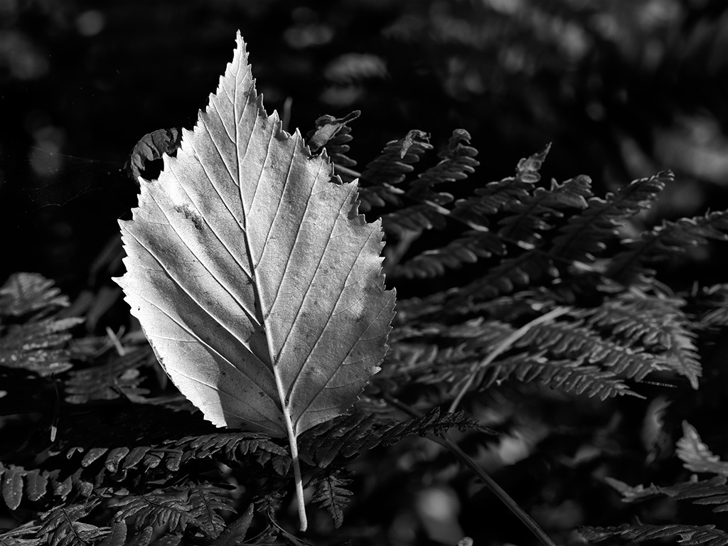 This Sitka Alder leaf fell onto some bracken and was lit by a small spot of sunlight breaking through the forest canopy. Alder leaves don't turn colour much, they just fall from the tree maybe a little lighter in shade and maybe a little more brown in tone. Fortunately our camera was right at hand because the spot of light only lasted for a few seconds. This image was envisioned from before the shutter button was pushed. The light coming from the right side was almost at the same plain as the leaf, amplifying its structure and texture. We find that black & white photographs emphasize texture in comparison to conventional clolour pictures.
