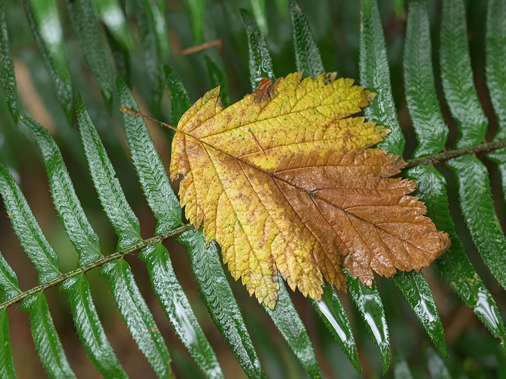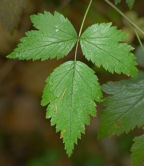 There are three Salmonberry leaves on a stem, as seen on the picture on the right. In the fall they turn colour, as the plant absorbs nutrients out of the trees to save over the winter. These nutrients are needed to maintain the chlorophyll that is key to photosynthesis and the leaves' green colour. Without the nutrients, the chlorophyll breaks down, changing the leaf's colour.