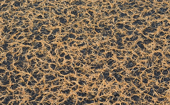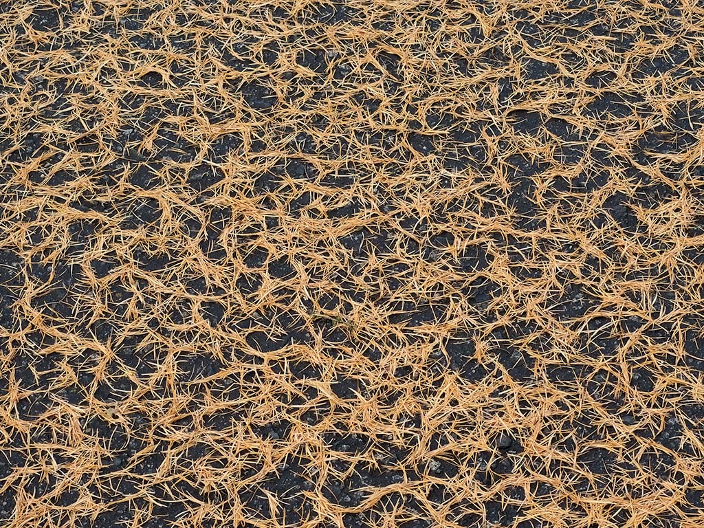 This picture shows Douglas Fir needles that have turned colour and fallen from their trees into a pond. After they randomly fell in, water surface tension pulled them into clumps creating the this interesting texture.