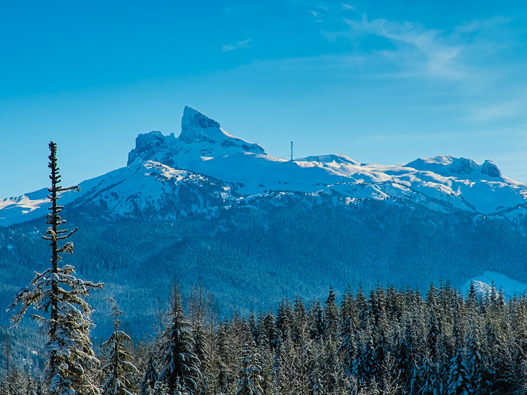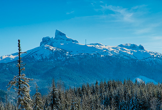 Black Tusk is a mountain south of Whistler, British Columbia. Both are north of Vancouver and can be reached by car via the Sea to Sky highway. This photograph was made from near the Callaghan Ski Resort west of Whistler village. This resort was one of the venues for the 2010 Olympic games. The rocky top of Black Tusk is the cinder cone of an old volcano. In this picture you can see the microwave tower that used to provide communication services to Whistler and Pemberton. In the more detailed computer background version of this image you also see that there is a second tower.
