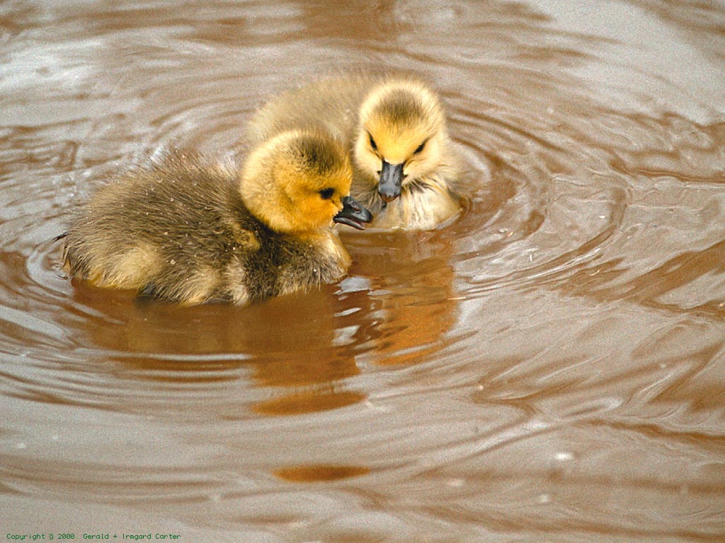 The goslings were probably away from their nest for their first time, these are very young ones. They grow very fast. Although these two were selected because it makes a pleasing composition, there were seven goslings in the family and both the male and female parents were looking over them.