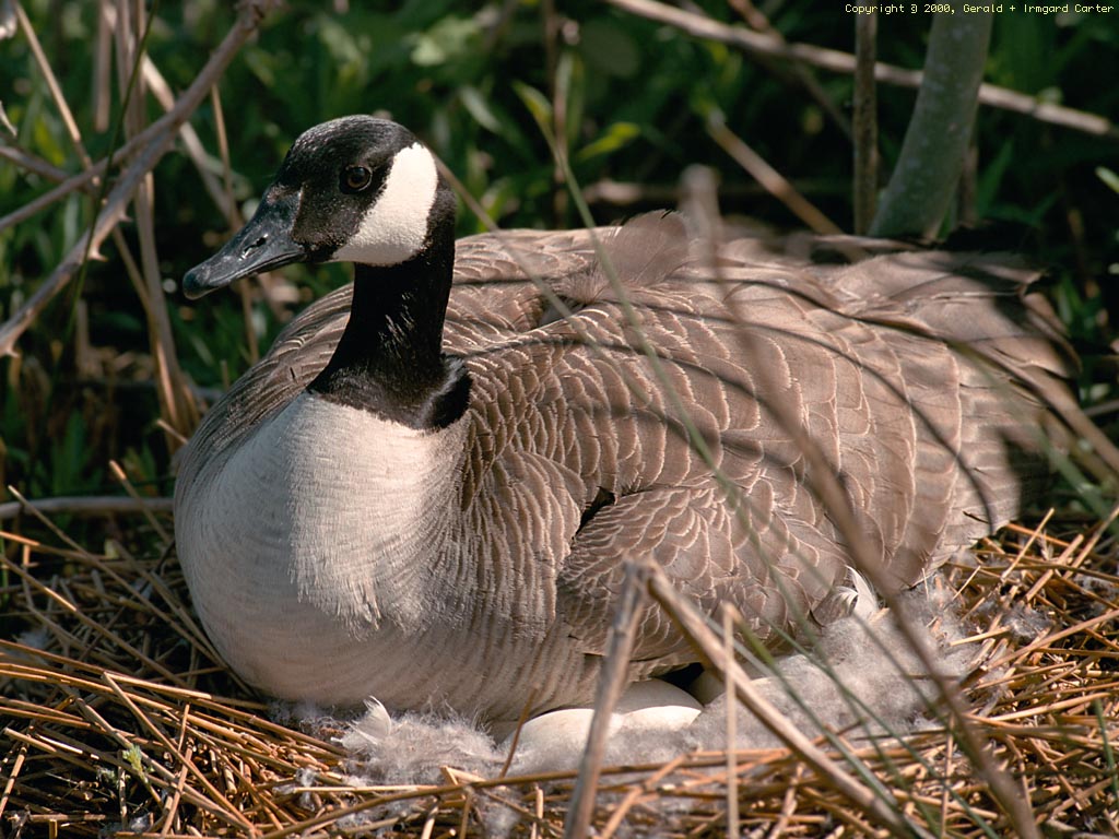 We visited the Reifel Bird Sanctuary on Good Friday and saw the first goslings of the year, so we thought this photograph would be appropriate. It was actually taken last year at about this time (mid April). The goose had chosen to place the nest right beside a walkway and had gotten used to human presence. A 200mm lens was used at a fairly large aperture (not recorded) to throw the foreground grass as far out of focus as possible. It was a sunny day, so the shutter speed (also not recorded) was fast enough to permit hand holding. The camera position was a compromise because of the grass and reeds, but we did try to find the best available while disturbing the bird as little as possible.