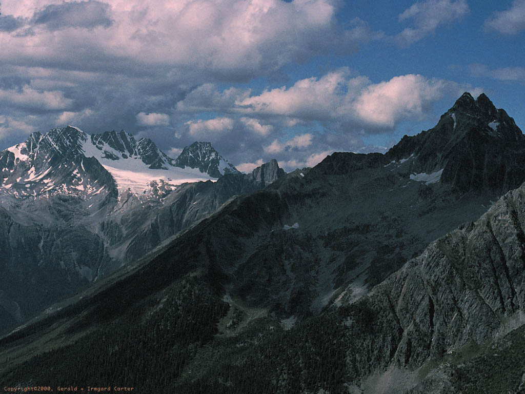 Glacier National Park in Canada is in the Columbia Mountains, west of the more famous Rocky Mountains. The Trans-Canada highway bisects the park and most travelers through the park associate it with the Roger's Pass section of the highway. Just north of the road's summit is the Illecillewaet campground from which a number of excellent hikes start. This photograph is from the Asulkan Valley Trail, a hike that I highly recommend.