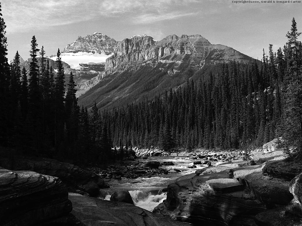 This is the Mistaya River and Canyon in Banff National Park where the Icefields Parkway meets Highway 11 to Rocky Mountain House. In the background are Mount Sarbach and Epaulette Mountain. These are the northernmost of the Waputik Mountains. In this area the valley widens and is surrounded on all sides by breathtaking mountains. It is also has fewer visitors as most people are just passing through on the parkway. In fact both Banff and Jasper have so many wonderful places to explore that if you miss this area you won't feel the less for it, but we plan to stay here a little longer next time we're in the mountain parks.
