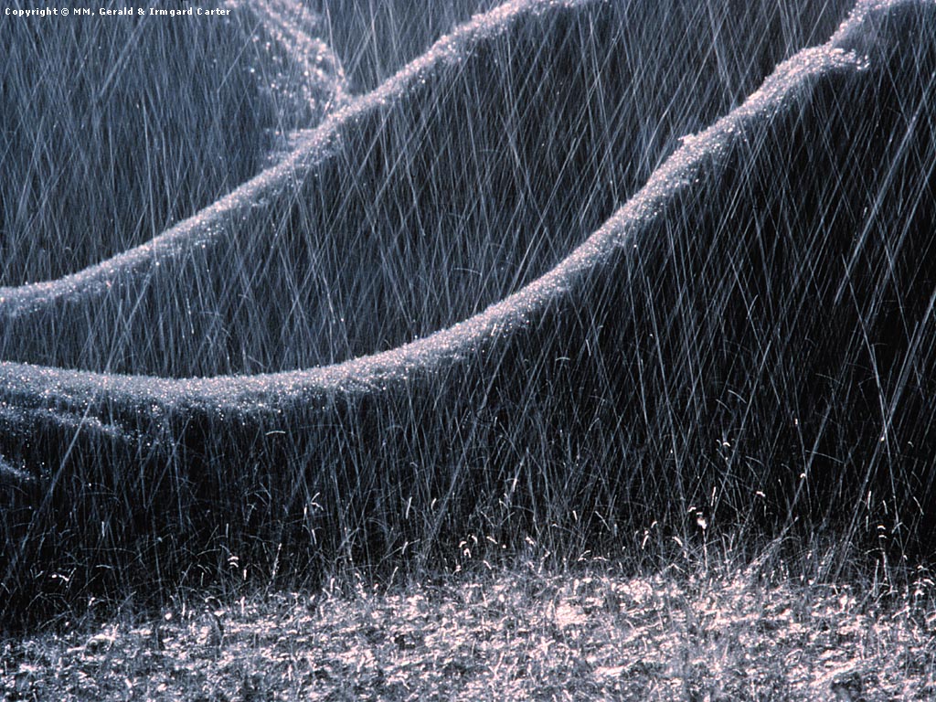 The camera can see things that the eye can't. This photograph was made with a 1/4 sec. shutter speed. As a result the paths of water drops become streaks and the splashes multiply as if the water was boiling. A telephoto lens was used, compressing the apparent distance between the mounds of built-up ice, emphasizing their height. You wouldn't have seen this picture by eye, and it takes some time to develop the imagination to guess what the camera would see. One benefit of a digital camera is that you can see what the image looks like immediately after the exposure. (This picture was made with a traditional 35mm film camera)