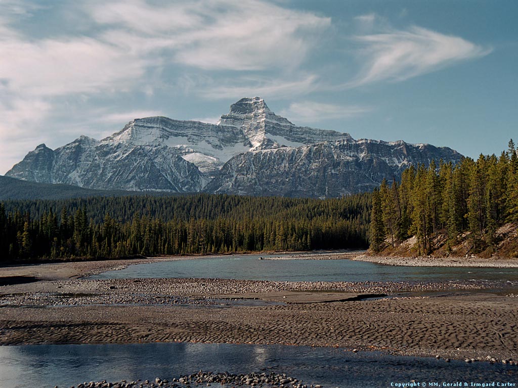 A 24-120mm was used at about 28mm. Exposure was at 1/125 sec. as this is the slowest speed we commonly hand-hold, no matter what the focal length. The camera choose the aperture, consequently it was the smallest possible without resorting to a tripod. A small aperture is important in this picture to provide acceptable sharpness from the nearby water to the distant mountain. If we had used our medium or large format cameras, we would use lens tilt to adjust the plane of focus to provide the same sharpness at their larger magnifications.