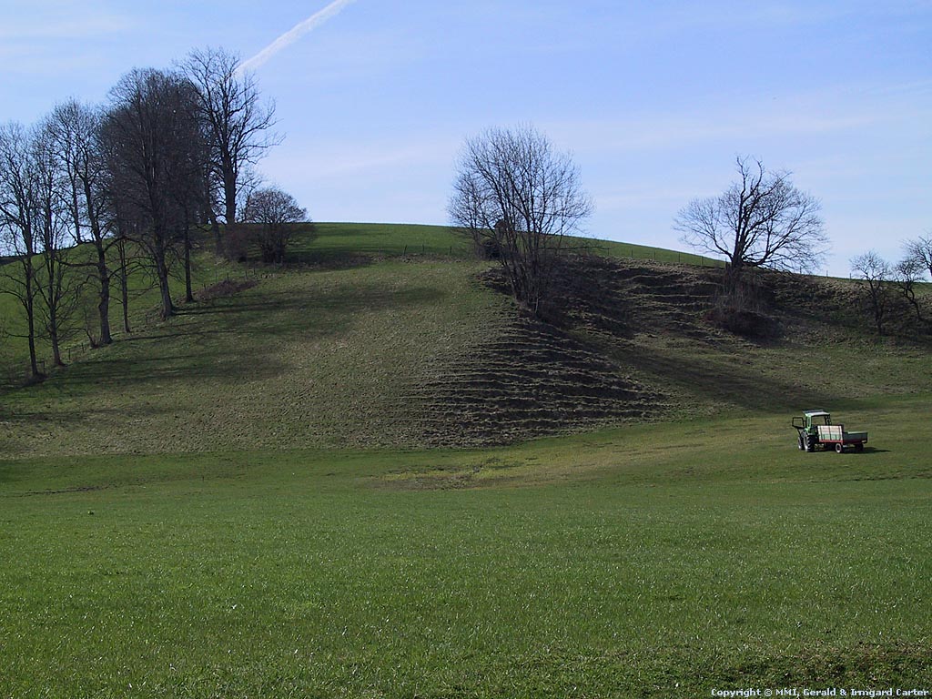 Here's a simple pastoral scene made this spring in the foothills of the Bavarian Alps. The field has probably been used for agriculture for hundreds of years. The reason for the picture is the step erosion in the steep area visible in the centre and right where is land is the steepest. There is a Bavarian tradition of sending their cattle into the mountains in the summer. Environmentalists are concerned about this practice because they are the cause of step erosion. The alpine soil is more fragile than the soil pictured and takes longer to recover.