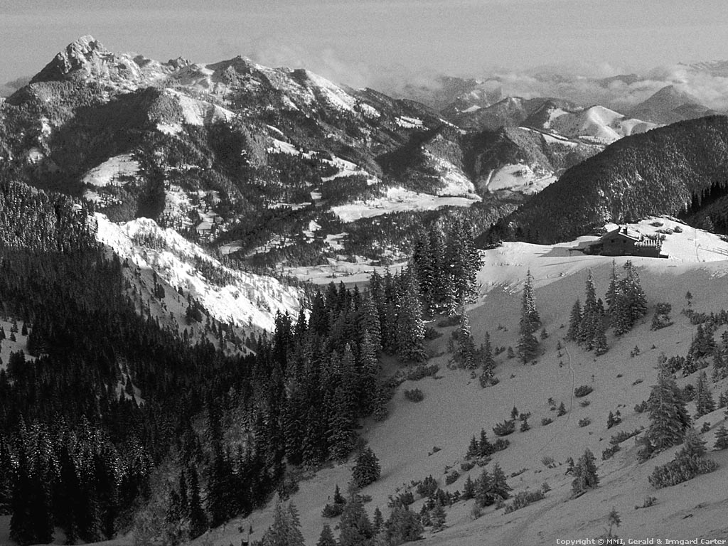 Irmgard's home town is in Oberbayern (Upper Bavaria), where the Alps meet southern Germany. When we were there several winters ago, we drove up the road to Spitzingsee and then took the aerial car to Taubenstein. From the top of the lift, this picture was made to the east looking towards the Wendelstein.
