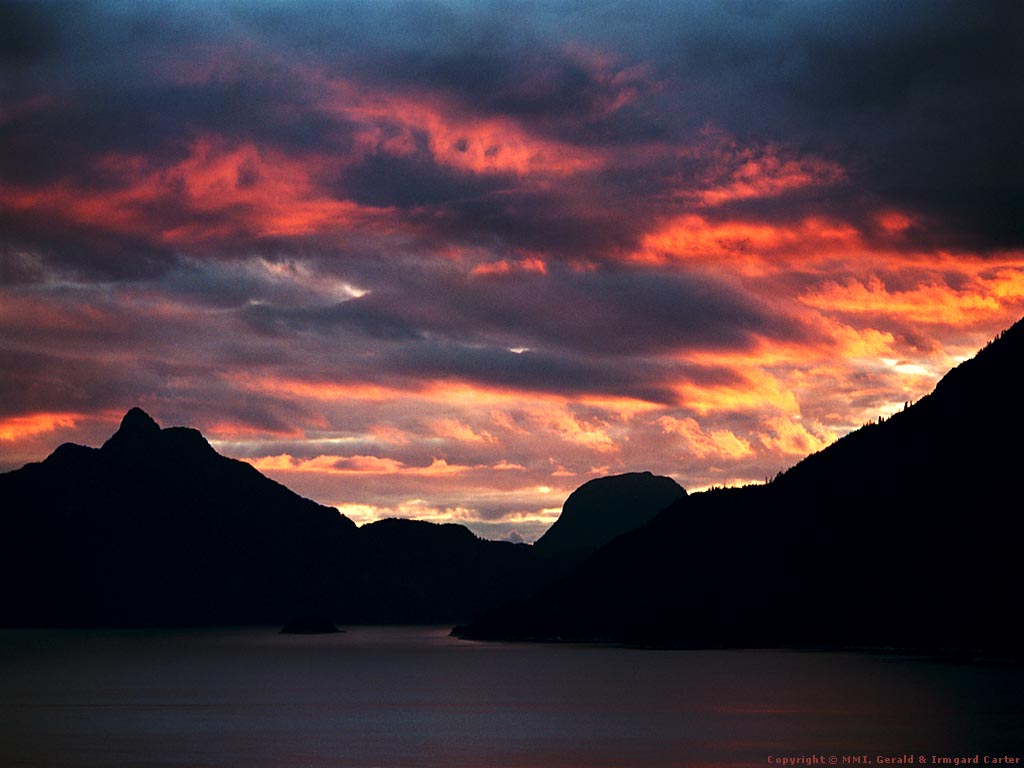 On our way back home from a trip to the Mamquam River valley, we saw the start of a breathtaking sunset. The sun skimmed just beneath the clouds to throw a red spotlight onto the occasional lower cloud. The result was a sky painted with almost every colour in the palette. Fortunately for us, there was a turn-out on the "Sea to Sky" highway with a clear view. As we set up the tripod, we were joined by a number of other people with their cameras.