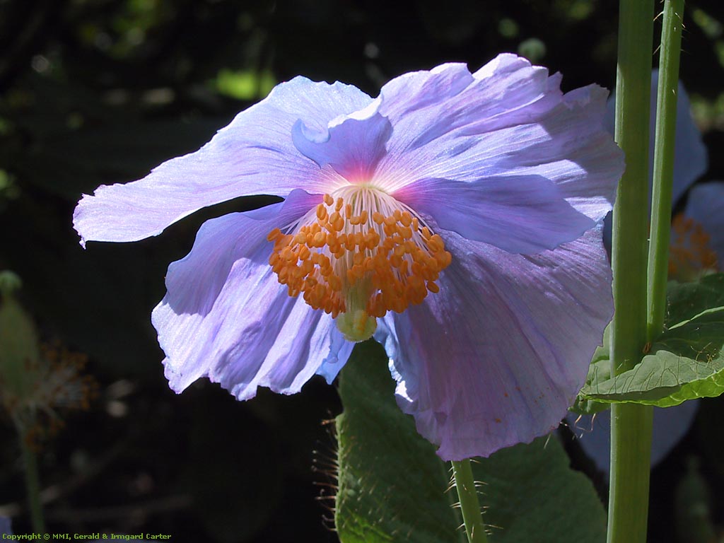 This decorative perennial, native to the Himalayas, grows to about waist height. The flower is about 10cm across. Here we see it with the sunlight shining through the petals, lighting the stamins from there base.