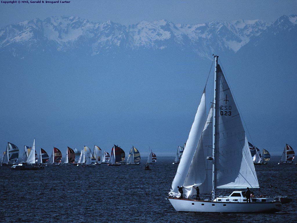 Every year, on the weekend after Victoria Day, a race is held for small sail boats from Victoria (British Columbia, Canada) around the Swiftsure Rocks at the Pacific entrance to the Strait of Juan de Fuca and back to Victoria. At the end of a race we were able to make this photograph. The camera was positioned near the end of Victoria's harbour breakwater. A 600mm lens was needed to give the boats a reasonable size. In the background are the mountains of the Olympic Peninsula in Washington State.