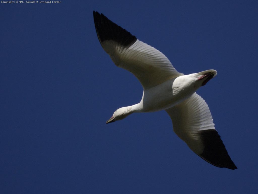 In October, thousands of Snow Geese are seen in the Vancouver area on their migration to points further south. We were experimenting with a mirror lens when a flock passed overhead. Several exposures were made, but the lens has a very shallow depth of field, so most were too fuzzy for our liking. This particular picture, however, is nicely sharp and shows that the lens does do a very good job. Capturing birds in flight is tricky and anyone attempting to do this should expect a low proportion of good images.
