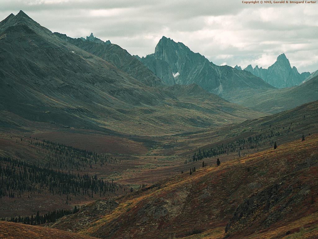 The valley shown here is around 75km from the southern end of the Dempster. There is a campground about 3km south of this location and a trail extends along the valley to the base of Tombstone Mountain. The trail is much too long for a day hike, a minimum of three days should be planned. Hikers have to be prepared for quickly changing weather.
