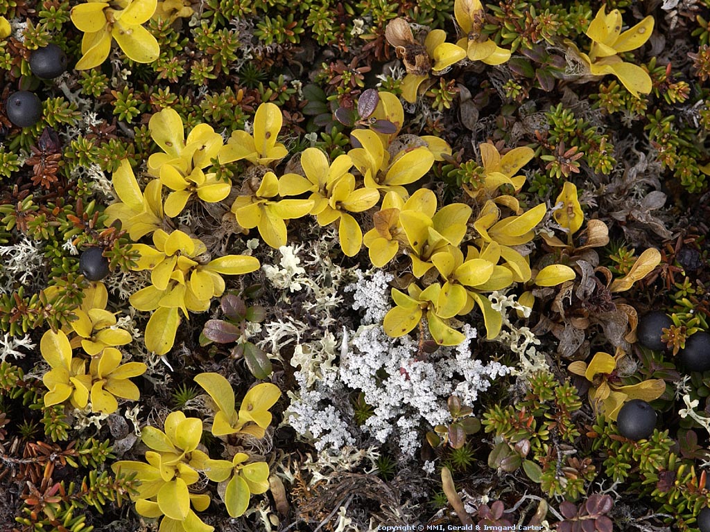 After a long and wonderful trip to Canada's north, you can expect a number of trip photographs. Hoping that we haven't yet worn out your patience, here's yet another one. This time it's from the Northwest Territories about two hundred kilometres north of the Arctic Circle. Here's a close-up of the ground cover: Crowberry, Lingonberry, Kinnikinnick, Willow, Caribou Horn lichen, and other small plants cover the tundra, barely an inch in height.