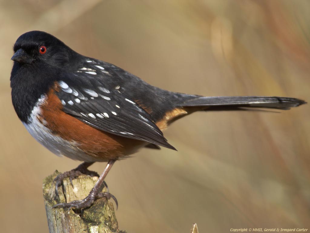 Some time ago there was a television program called "Northern Exposure". In one episode a character called "Holling" was out with "Ruth-Ann" trying to photograph a rare Rufous-sided Towhee. In Alaska this bird might be rare (I'm not sure that it goes that far north) but around Vancouver it is a fairly common sight at anytime of year. Despite their numbers, it is somewhat difficult to get good photographs of this bird because it likes to stay hidden inside bushes. Even when it is otu in the open, it doesn't stand still in one spot for very long, frustrating attempts at good composition. This little fellow however constantly landed on the top of a stump between quick foraging trips and so allowed this photograph to be made.