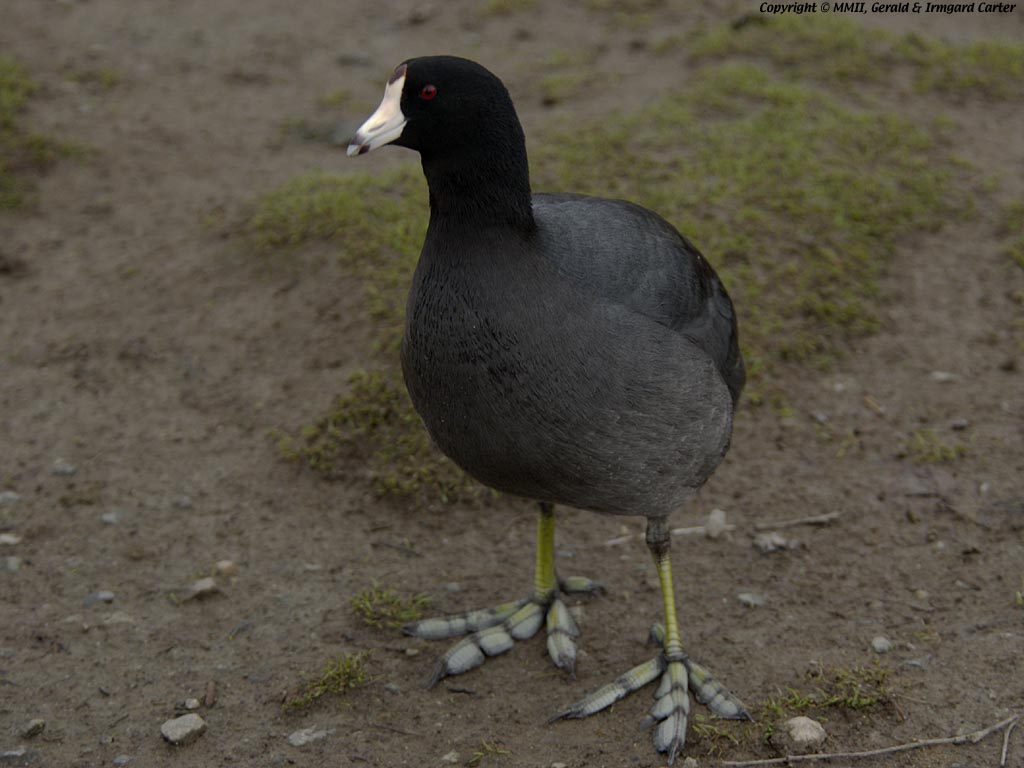 The American Coot is a common sight around the waters near our home in Vancouver, Canada. It is a difficult subject to expose well because the feathers are so dark and the beak is so bright. Here we managed to preserve detail in both areas. They are more often sighted in the water than on land. Perhaps they are too modest to show off their huge and brightly coloured feet.