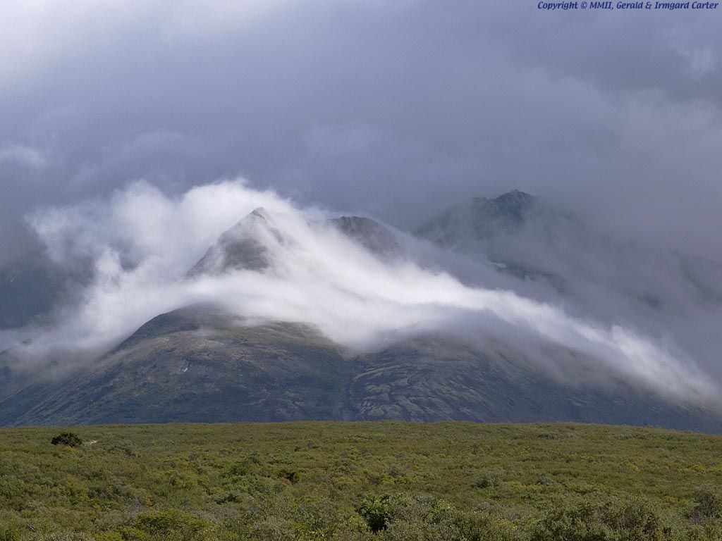 The Haines highway cuts through the far northwest corner of the Canadian province of British Columbia on its way to Alaska from the Yukon. Close to the border with the Yukon, we witnessed this cloud enshrouded mountain receiving sunlight through a small opening in the clouds overhead. Despite the darkness of the clouds seen in this picture, we had a nice dry day.