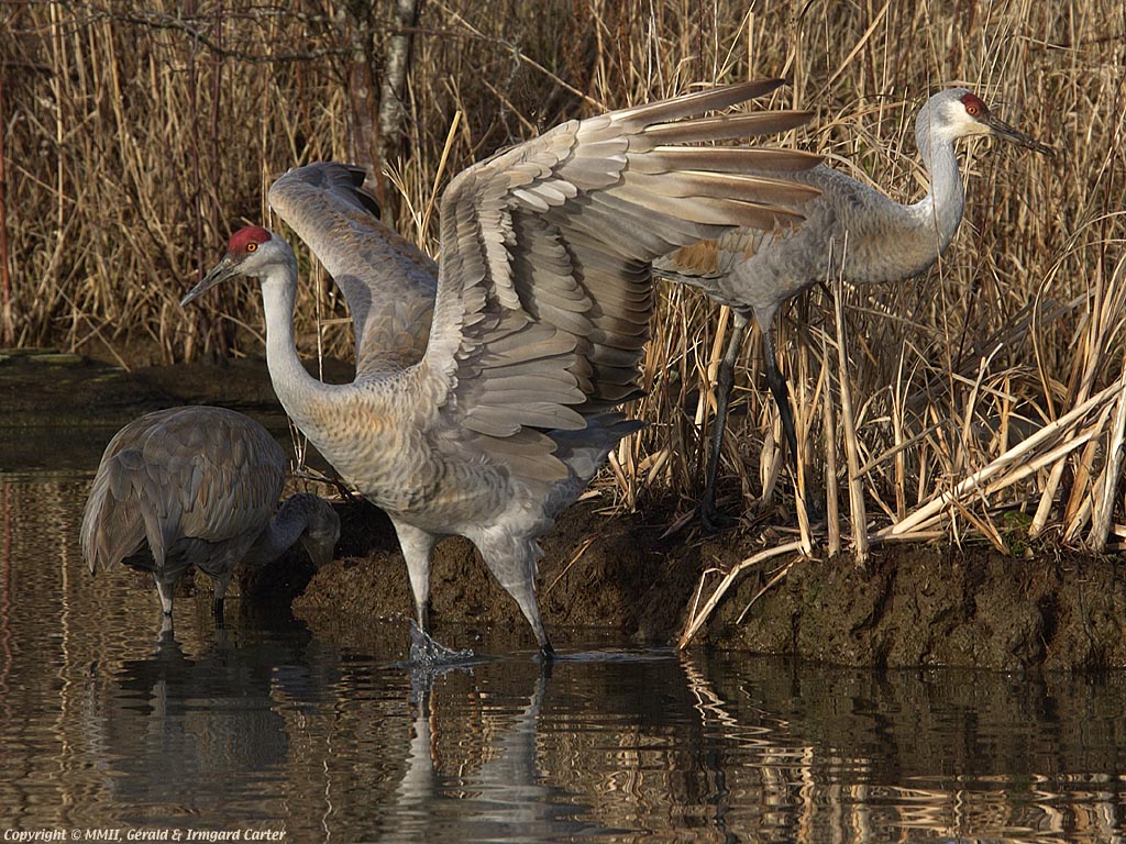 Regulars to our website know that the Reiffel Bird Sanctuary is a frequent destination for us. As a result, we have been able to see a couple of Sandhill Crane raise their chick. Even though the chick is an adult, she stays with the parents. Although all three are strong flyers, they don't venture too far from the santuary.