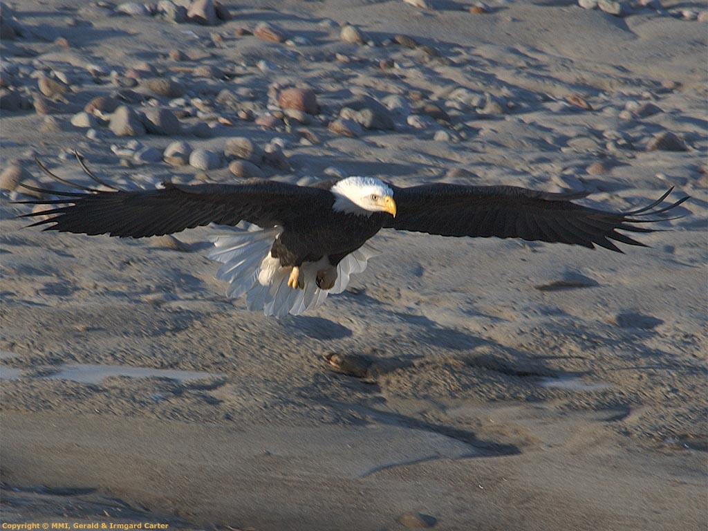 Starting in November there is a run of Coho Salmon up the Squamish River. This attracts many eagles to the area, which in turn attracts many photographers! The weather was poor so we missed the height of the run, however there were still a few dozen eagles and were able to catch this bird in flight on his way to the edge of the river.