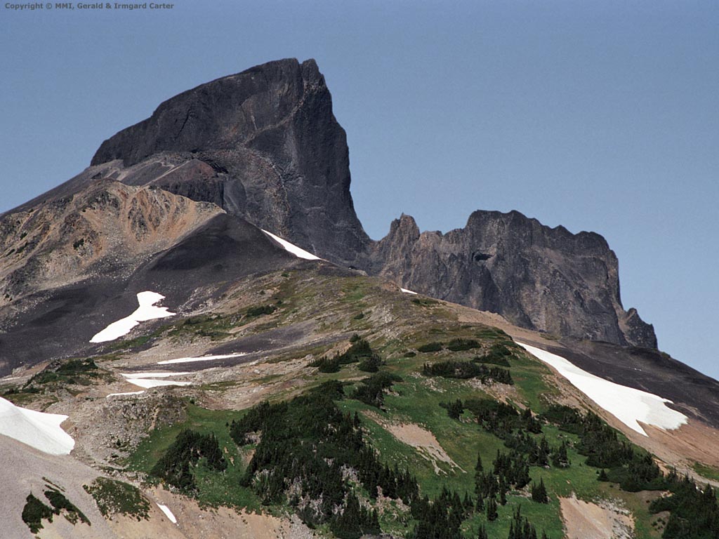 After a strenuous hike, gaining some 1200m of altitude from the parking lot at Rubble Creek, one is rewarded with this view of Black Tusk the remnant of an old volcano. This picture was taken from the trail to Panorama Ridge.The alpine meadows were in full bloom, and the mosquitoes were a real nuisance, typical for the short summers in the Coast Mountains.