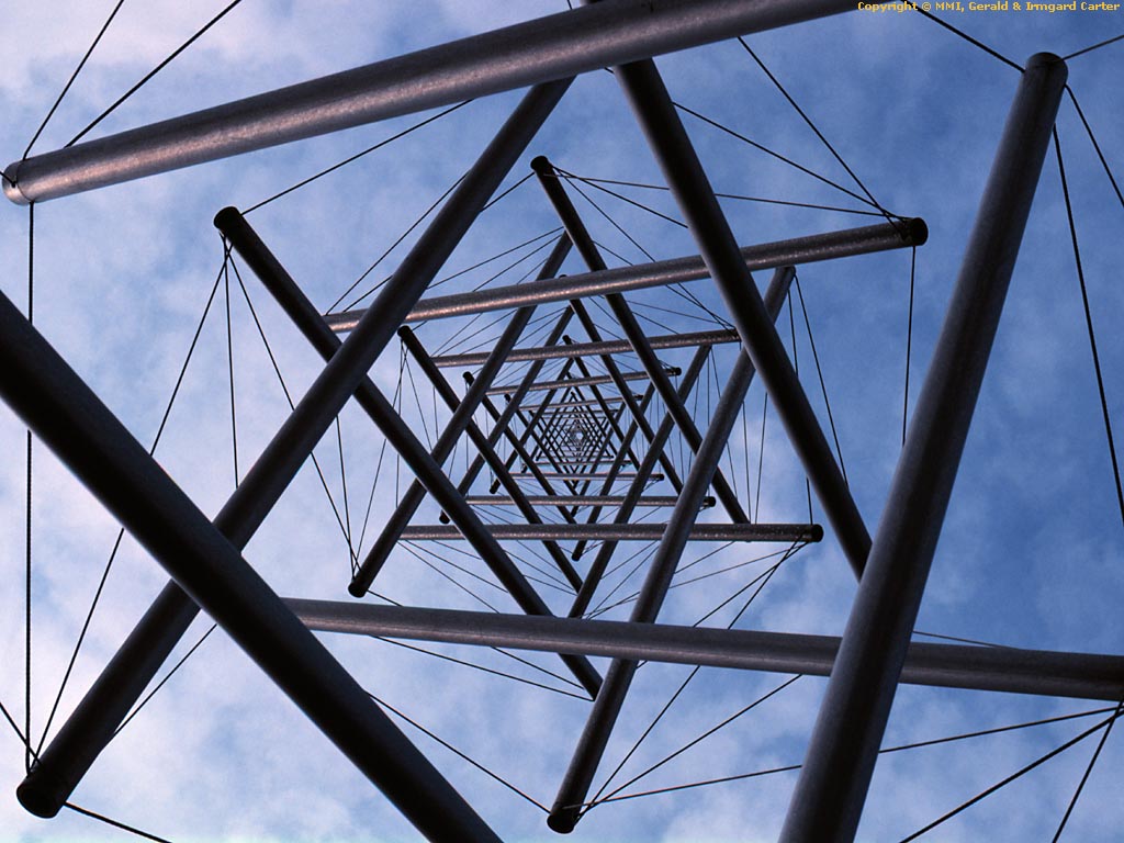 This photograph was made quite some time ago in the Hirshhorn Sculpture Garden, Washington D.C. This particular sculpture, by Kenneth Snelson, is made with aircraft grade aluminium tubes and stainless steel cable. The pipes do not touch each other, they are held in place only by the flexible cable. The cable only goes from the end of one pipe to another, there are no cables to anchors in the ground. The bottom 3 pipes are fixed into a concrete pedestal. The pipes are about 2 metres in length and the whole sculpture (based on memory) is some 30 or 40 metres tall. This kind of structure (where there is a mix of purely tensile and purely compression components) is known to mathematicians as a "tensigrid". The photograph was made straight up from the centre of the pedestal.