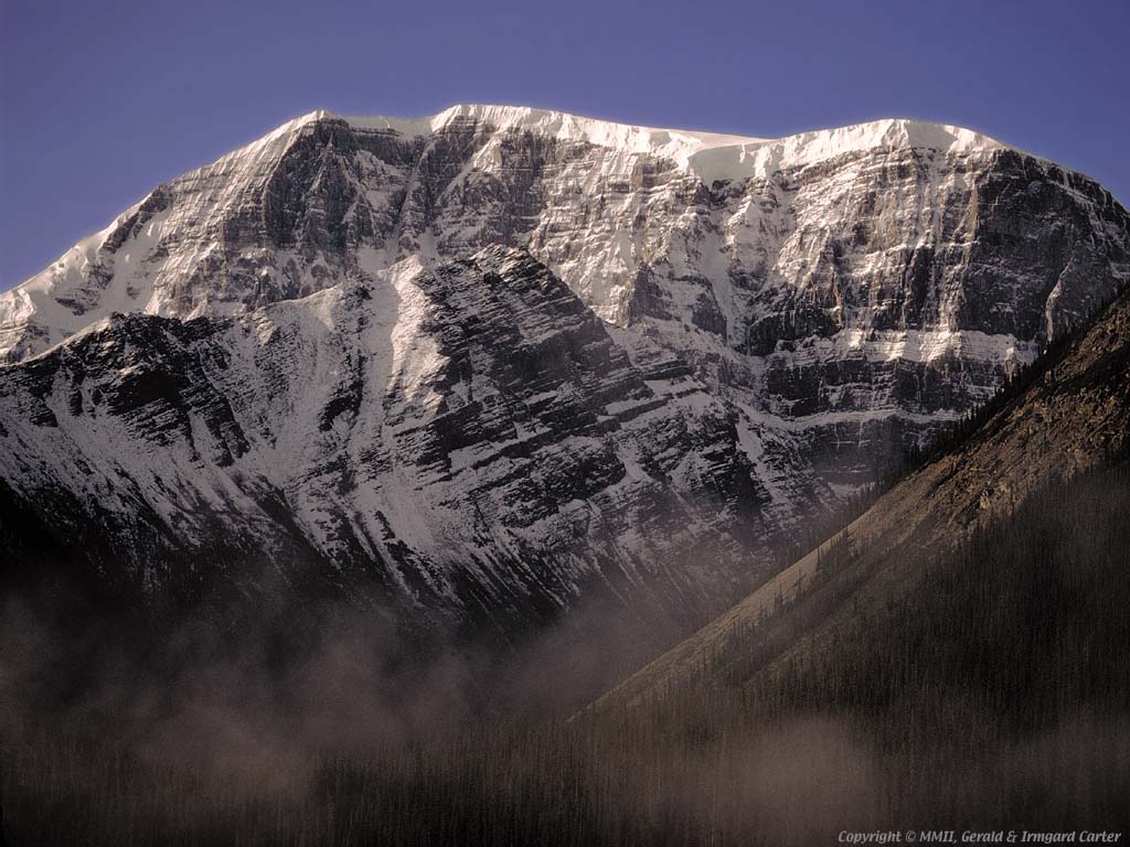 The mountain shown here is a Rocky Mountain from the Kananaskis, south of Banff. It had snowed the previous night and the sun warming the cold melt water streams kicked up the thin fog at the bottom of the picture.