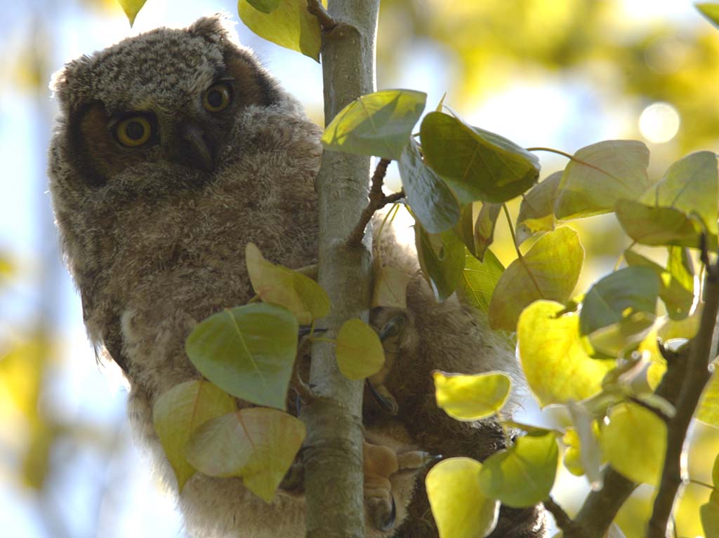 We had spotted a pair of Great Horned Owls that had obviously built a nest in the hollow of a tree that had broken in the wind. The problem was that the hollow was in a difficult place to photograph. The fact that the female was staying at the nest meant that she was sitting on eggs and therefore the pair would be staying around for some time. We returned to the site several times but only managed marginal photographs of the parent Owls. Finally the chicks wandered out of their nest, able to climb but still unable to fly. The chick in the photograph climbed down to a lower branch and then proceeded out to where the branch was thin (and probably unable to support the weight of a predator) and there were fewer obscuring leaves.