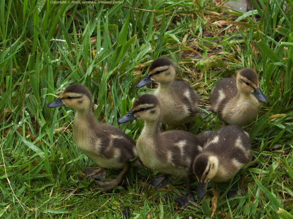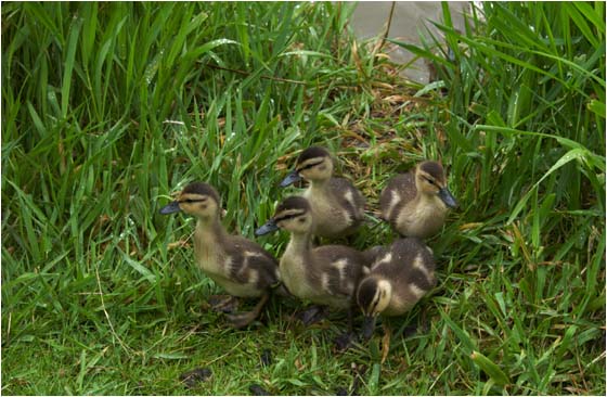 Every spring we look forward to photographing the new hatchlings at the Rieffel Bird Sanctuary. The weekend that we happened to visit had rain showers through the day so fewer human visitors were around. The ducklings, already habituated to handouts of grain, were looking to use for a tasty diversion from the regular grass. They are pictured here at the end of a short duck path from the water to the human's path we were on. They received a small handful as a modeling fee.