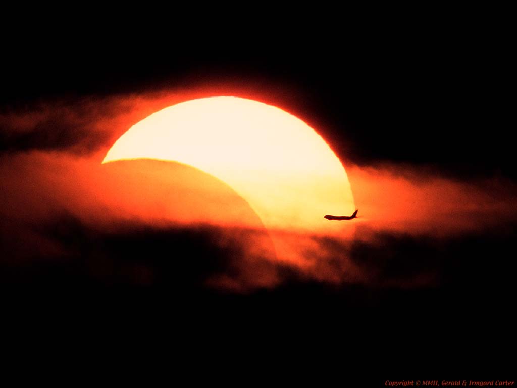 We couldn't really see the image in the camera, we just made a series of exposures. It was only after the film was developed (we do most of our own development, but we don't process Kodachrome) that we saw a plane that probably had just taken off from the International airport had made an excellent composition with the eclipse in the background. The profile of the plane is clearly that of a Boeing 747.