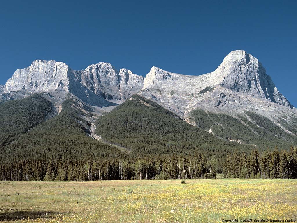 The Rocky Mountains consist of many ranges that span from the Yukon to the middle of the U.S. The many mountains are not made of the same materials. This scene, north of the Lake Louis area, shows very tall mountains of quartzite. This material is harder than steel, it is a sediment of containing small quartz crystals.It weathers very well, but shatters and crumbles under stress. It makes for tall, very steep mountains.