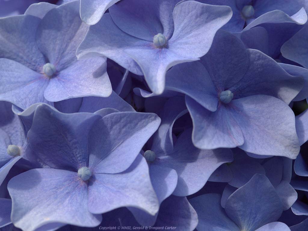 Here's a close-up of the flower head of a Hydrangea plant. The plant itself is a tall shrub, about 2 metres in height. The flower head is a global of flowers about 20cm in diameter. (In fact the little buttons in the middle are the flowers, they are surrounded by "sepals") The blue of this particular Hydrangea head indicates that it's soil is somewhat alkaline and contains aluminum. In acidic soils this plant would have pink flower balls.