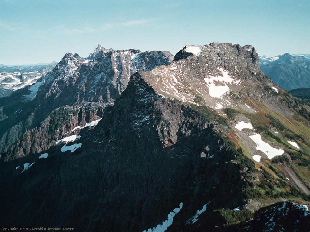 The first picture is the view to the south. Here you see Lady Peak with Lucky Four behind it. The Cascade Mountains are in the distance.
