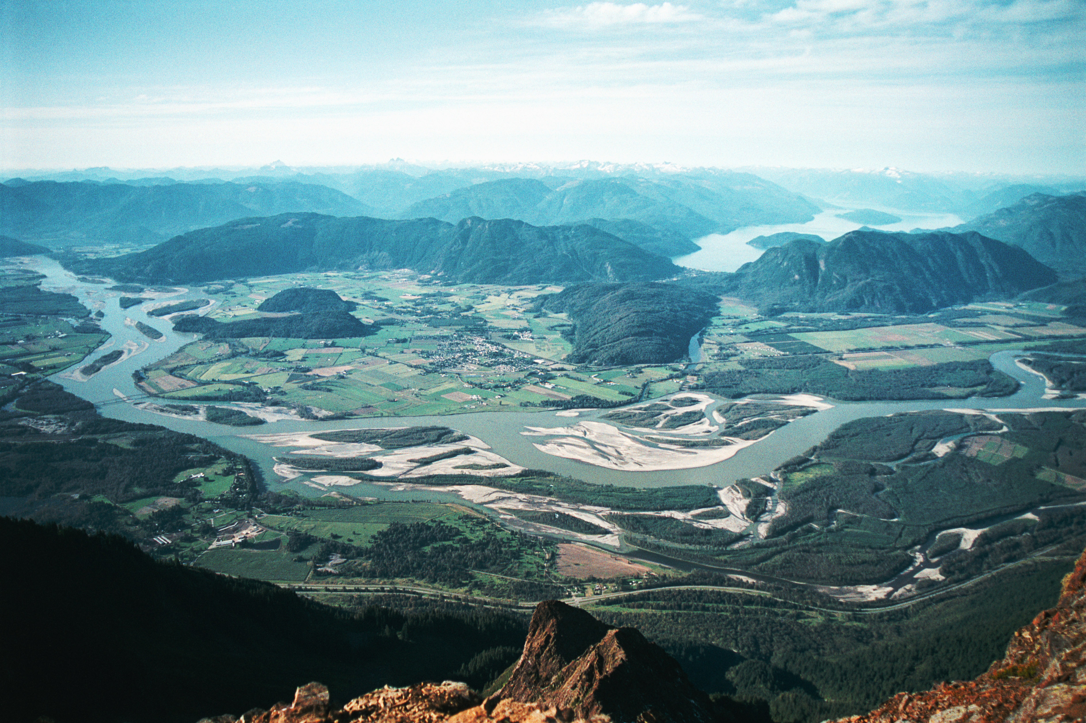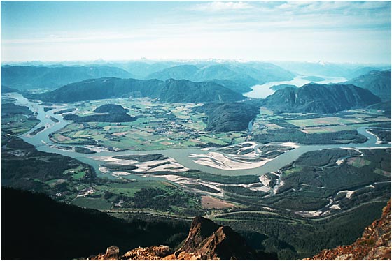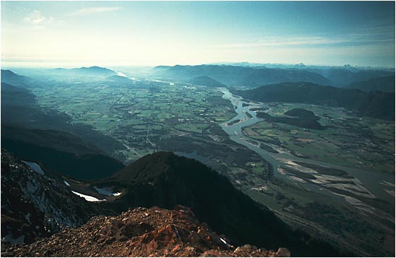 The third picture is the view to the north. This picture was made with a wide angle lens (a 24-120mm Nikkor at the 24mm setting). The Fraser River underlines the township of Agassiz and its surrounding farms. Harrison Lake and the coast mountains are in the background. The Trans-Canada Highway makes its way along the bottom of the picture. A high resolution copy of this image is available here. Note: this file is very large - 2.4MB.