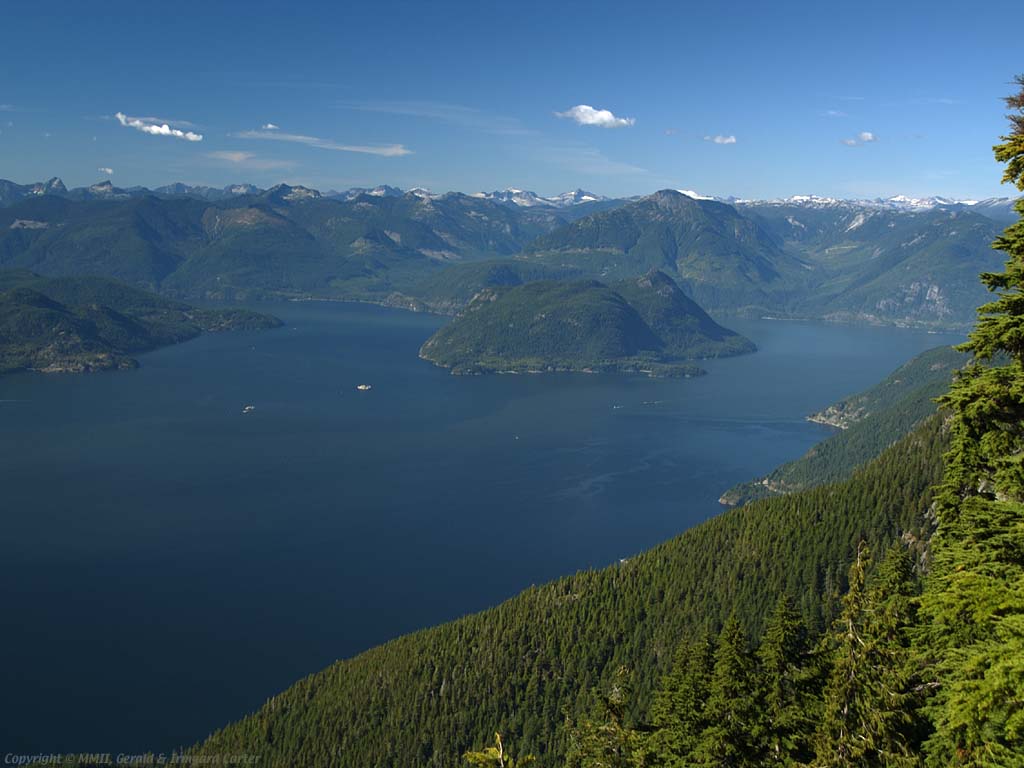 The North Shore Mountains have many hiking trails for those people seeking exercise with excellent scenery. This image was taken from St. Mark's Lookout at 1360m , a stop on the Howe Sound Crest Trail to the "Lions" in Cypress Provincial Park. It takes about two hours from the parking lot at the Cypress Ski lift - longer if you stop to eat the blueberries.