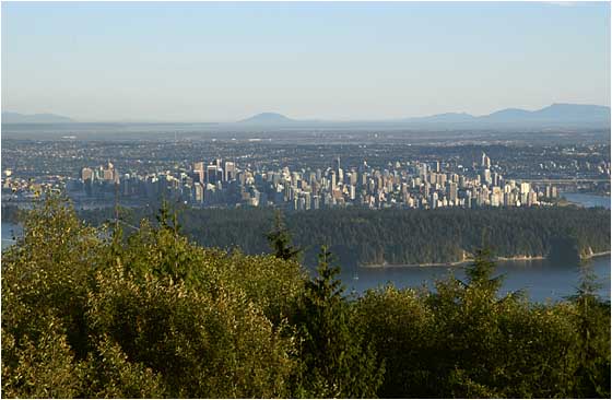 Vancouver itself is not visible from the trail until you near the Lions. However the following view of the city is from a stop along the road at the south end of Cyprus Mountain Park. By the way, there are several mountains in this park besides Cyprus, some of which are Hollyburn Mountain, Mount Strachan, Harvey Mountain and Black Mountain.