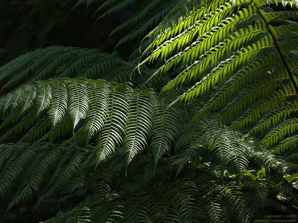 These ferns were photographed in the "Fern Glen" at Vancouver's Van Dusen Gardens. The extensive glen has dozens of different ferns on multiple pathways. These were well shaded except for a shaft of light coming towards the camera lens, allowing you to see sunlight both reflecting off the top and penetrating the fronds (fern "leaves").