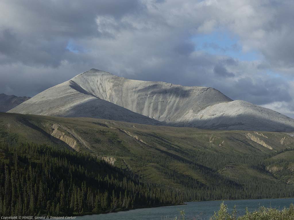 This photograph was made in northern British Columbia from the Alaska highway. Heading towards the Yukon, this area is just west of Summit Lake Provincial Park, several kilometres before reaching Muncho Lake. The river on the south and impassable cliffs on the north forces the wildlife in the area to a narrow corridor where they are easily viewed from the highway. Our photograph of a stone sheep was made nearly at the western end of this corridor, this photograph is from the eastern end.