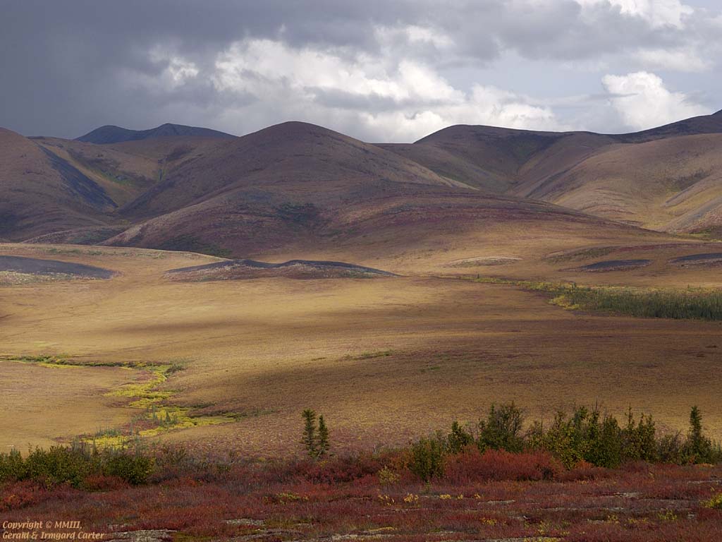 This photograph was taken from the Dempster highway at the arctic circle. This is the same place where we made the picture that we have on our main web page. The trees in this area are only waist high, most of the vegetation is small and tough. The hills are very weathered mostly ground down to gravel. Willow grows in the slight depressions created by run-off giving the yellow colour in the fall.