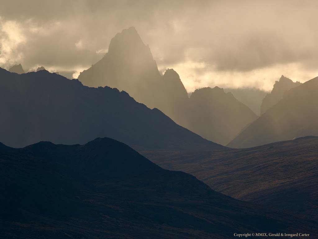 This picture of Tombstone Mountain was made in Tombstone Park in the Yukon. We were on a rise above the Dempster Highway, a rain shower was falling on the mountain and little further in our direction but not on us. A hole in the clounds briefly opened lighting the rain and the clouds. A long telephoto captured the scene, compressing the many ridges between us and the mountain.