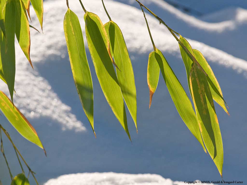 This photograph was made when Vancouver had an uncharacteristic heavy dump of snow. The low winter sun backlit these bamboo leaves in the Van Dusen Botanical Gardens. It's a nice splash of colour over the white and blue of the snow.