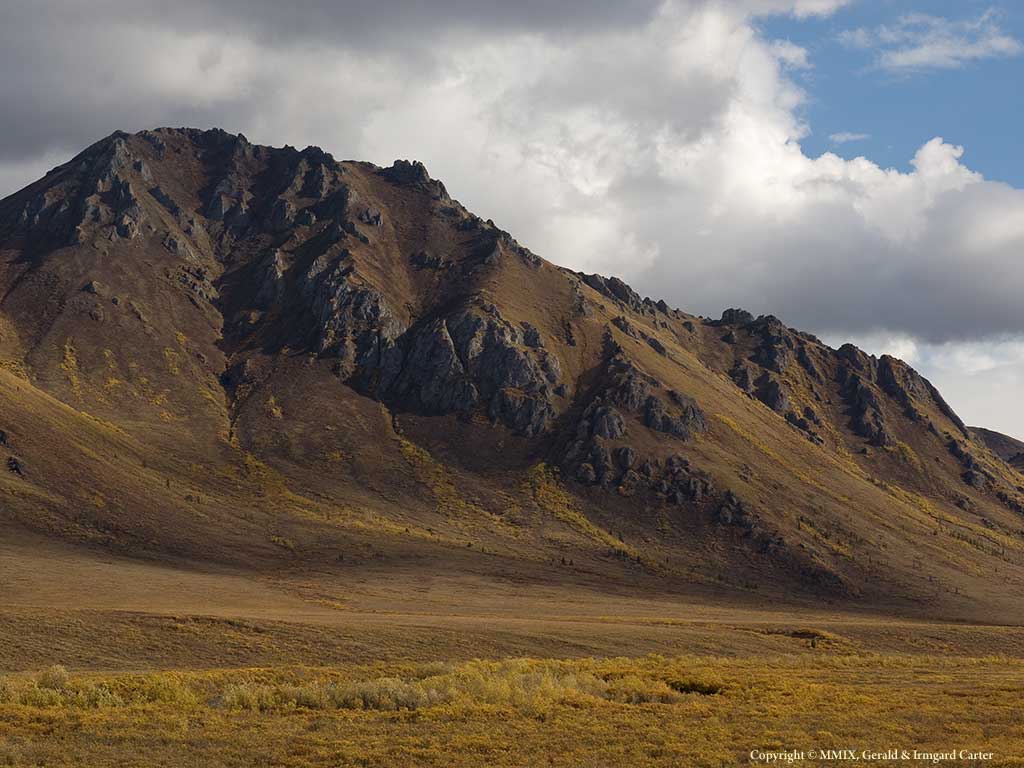 This is a picture of a mountain from the Ogilvie range, North of the Tombsone Mountains along the Dempstter Highway in the Yukon. It is heavy eroded from the severe weather and the many millennia it has existed. This picture was made in the late summer when the tundra has turned to its fall colours.