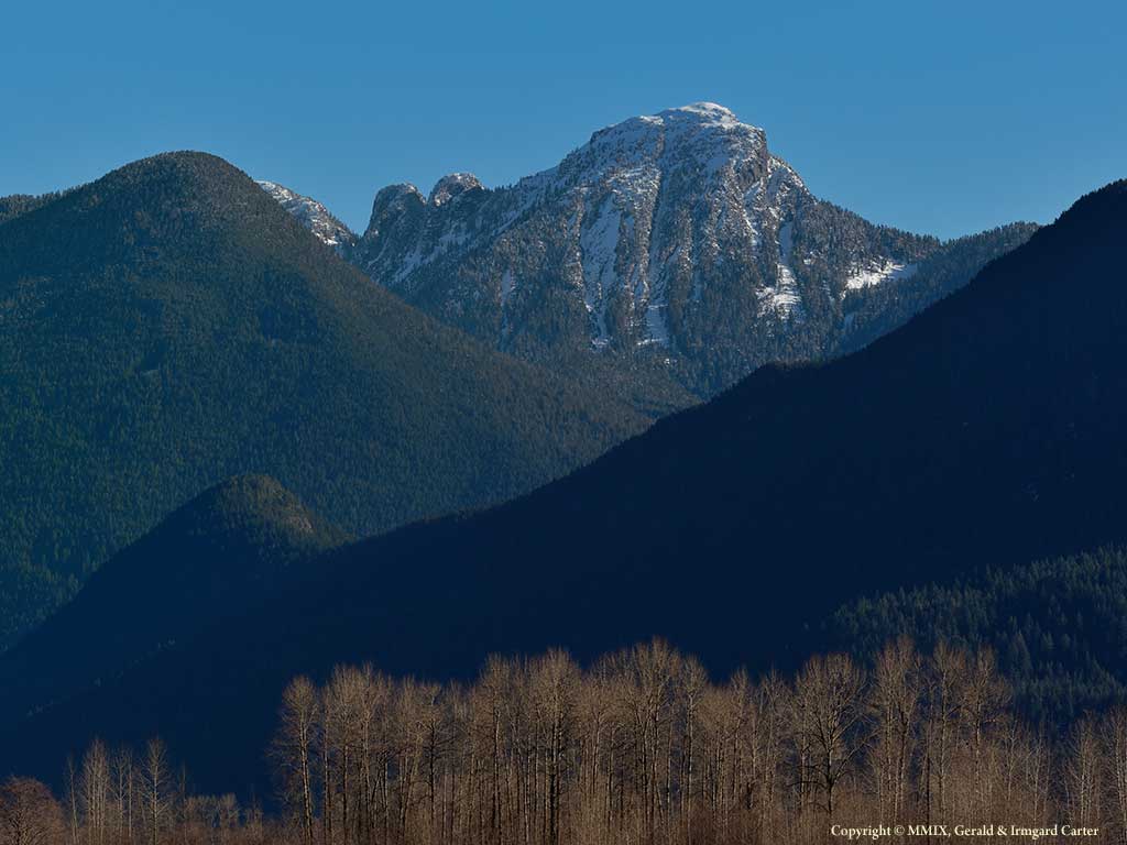 This image was made from a dike near Pitt Lake, in the eastern part of Greater Vancouver. This peak tops out at 1528m but we could find no name for it on any of our maps. There are many peaks and true wilderness areas within sight of urban Vancouver. This peak is just one example.