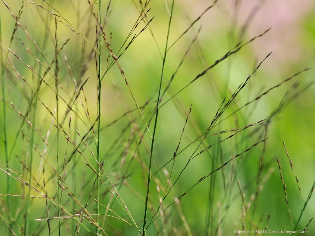 These grasses were growing wildly in a nearby park. The colour in the background were flowers growing wildly, likely escaped cultivars. There are a huge number of grass species, but we're afraid that we don't have the knowledge to differentiate one from another. This grass was slightly over a metre tall. The camera's shallow depth of field picks out just a few strands when the stand was at least a couple of metres thick. The camera was focused only about 30cm from the end of the lens and about a metre off the ground.