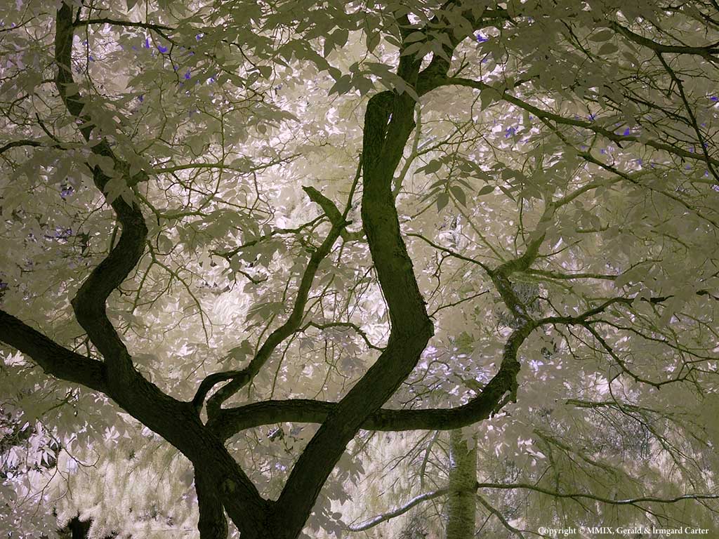 We have been able to guess what an infrared picture might look like, grass and trees are very light, rocks and lichens are dark, but until you actually made the photograph you really don't know what the actual picture will look like. This picture was made of the underside of a tree. The result is very nice and was unexpected. The colours are "false" in that they were not formed from visiable light, but from different parts of the infrared spectrum.